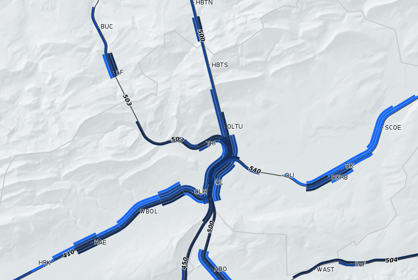 The visualization is based on the whole track network being split into segments based according to the data which will be visualized. There are similar line segments for each event/activity-type at a track. These line segments are then grouped by their geometry and then drawn at an offset parallel to the train tracks. The offset, color as well as the width of these resulting ribbons show the type as well as importance of the visualized event.